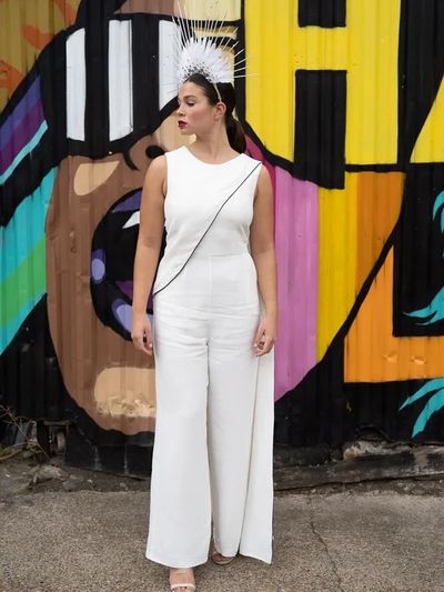 This contemporary bridal jumpsuit with a striking sari-inspired train is made from a textured Italian matte crepe for a tailored look.